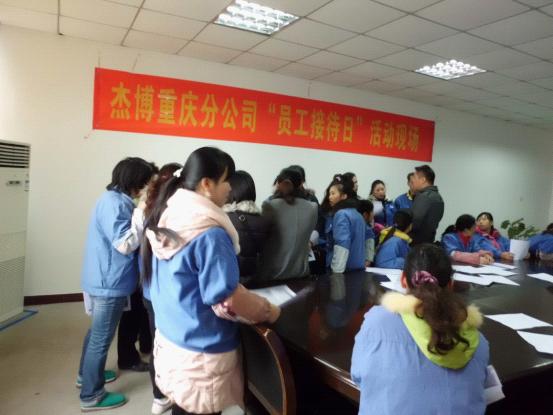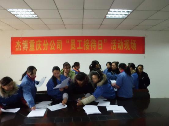 為更好的傾聽員工心聲,切實幫助員工解決工作上存在的困惑、生活上遇到的問題,本著“關(guān)心工作、關(guān)心生活、關(guān)心成長”的杰博服務(wù)文化,“為客戶服務(wù)的心,永無止境;為員工服務(wù)的心,永無止境”的服務(wù)宗旨, 致力于成為中國人力資源服務(wù)行業(yè)“員工服務(wù)效率”和“員工滿意度”最高的人力資源服務(wù)機構(gòu)的服務(wù)目標(biāo),2011年12月23日我司聯(lián)合客戶單位舉辦了杰博重慶分公司“員工接待日”活動。